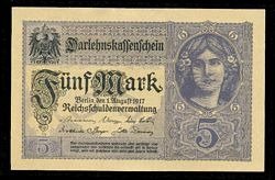 ALEMANIA [Pick 56] 5 Marcos 1917. Cara de Mujer. UNC