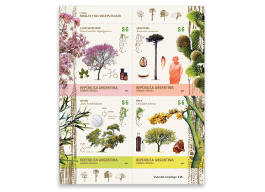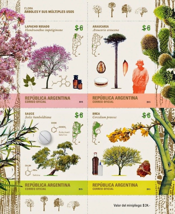 Árboles de usos multiples, viñetas: Lapacho rosado, Sauce, Araucaria, Brea.//Formato: minipliego de 110 x 90mm.// Fecha de emisión: 27 de abril de 2015.