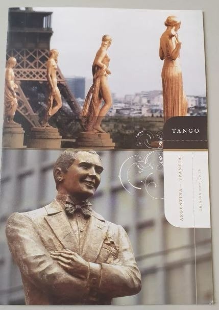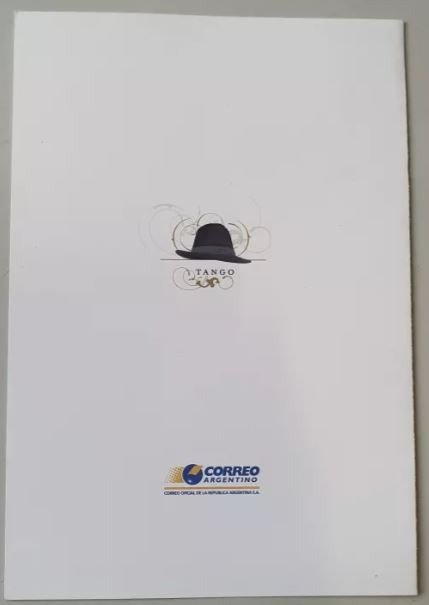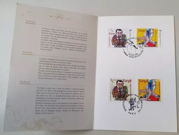 Díptico que contiene la serie matasellada (primer día de emisión) de los sellos postales emitidos por el Correo Argentino y el Correo de Francia. Temática: el tango. Las viñetas están ilustradas por el artista plástico Antonio Seguí.