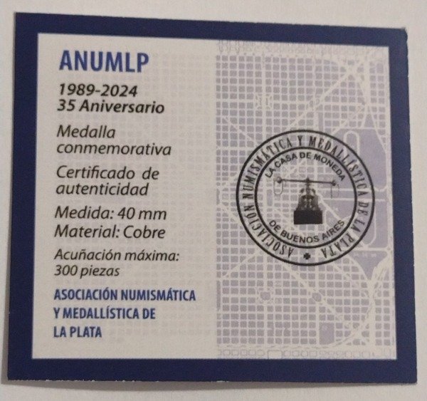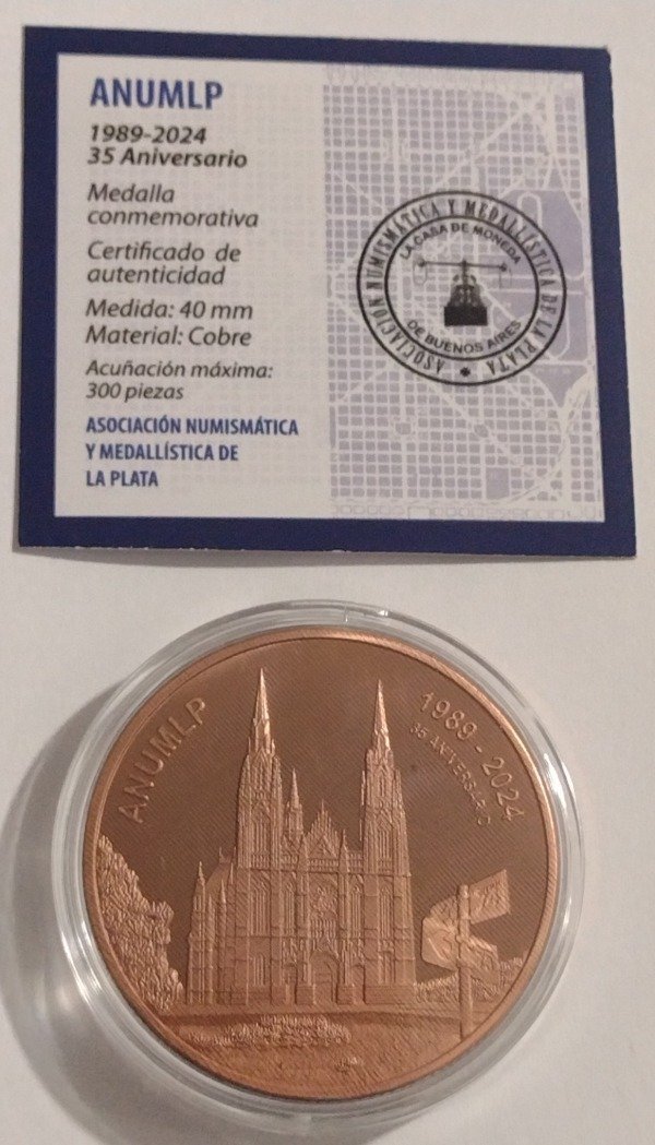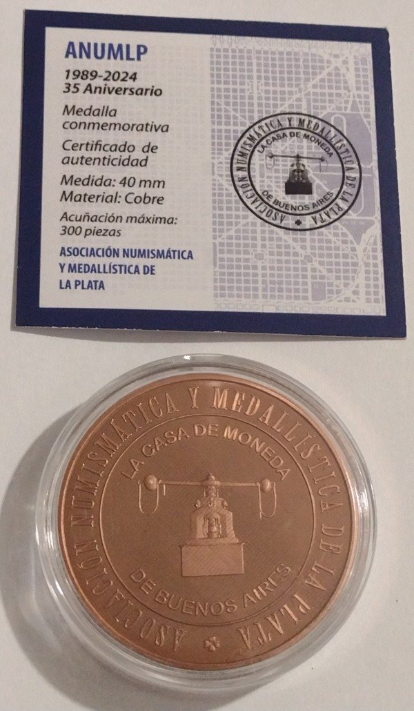 Medalla emitida por la Asociación Numismatica y Medallistica de La Plata, con motivo del 35 aniversario de la Institución (1989-2024)