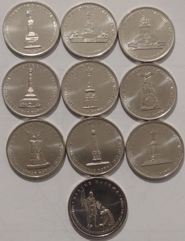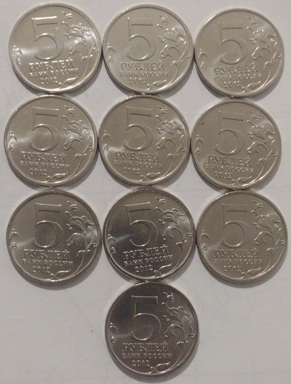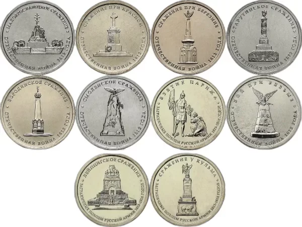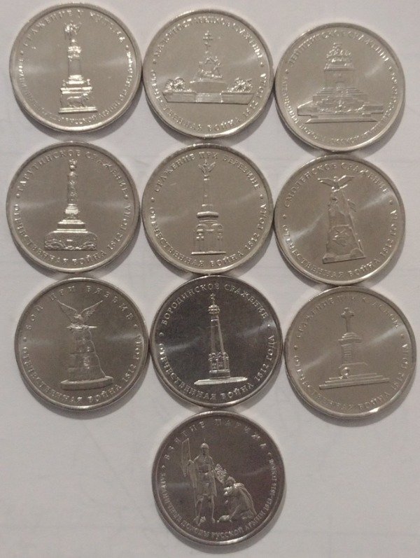 Rusia lote de 10 monedas de 5 rublos 2012 serie Borodino (monumentos)